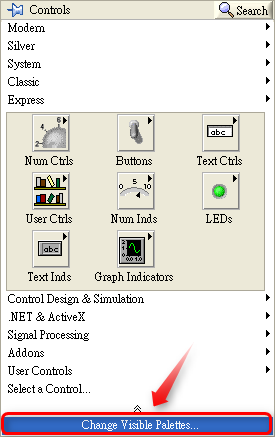 打開視窗後,你會看到 Controls Palettes 預設只看得到 Express, User Controls 和 Select a Control 這幾個分類的 Controls: